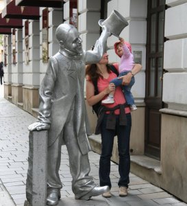 In the early 20th century there was a poor man, Ignác Lamár (nicknamed Schöne Náci), who was inspired by his grandfather a famous clown, to bring happiness to others. He experienced existential difficulties and great sorrows during his life, his younger lame brother was admitted to an institute and he lived alone since a child, and had to support himself. He found modest work in a theater, and later as a cleaner, but his desire was to give others joy, humor, love and laughter. He could often be found in one of the town’s many cafes, where citizens would buy him a pastry or coffee. For forty years he walked around the town in threadbare top hat and tails, bowing courteously, greeting women with the old fashioned greeting, “I kiss your hand” in German, Hungarian and Slovak, and handing them a flower. His life size statue (by Juraj Meliš, 1997) stands on Rybarska street between the main square and the opera, and he is raising his hat and beaming a greeting to all who walk by.