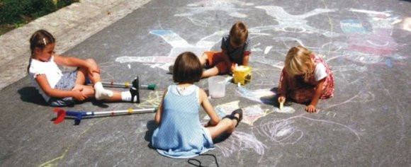 Give some children chalks and a pavement and they will immediately collaborate to color the street with patterns and drawings. Children learn to make their own inexpensive chalks by mixing chalk powder and pigment with a little water, rolling handfuls into sticks, and letting them dry. Then they are off. In English “play streets”, in Italian piazze, and in European “Wohnstrasse” (Living Streets), children – and their chalk – have free reign for creative expression.